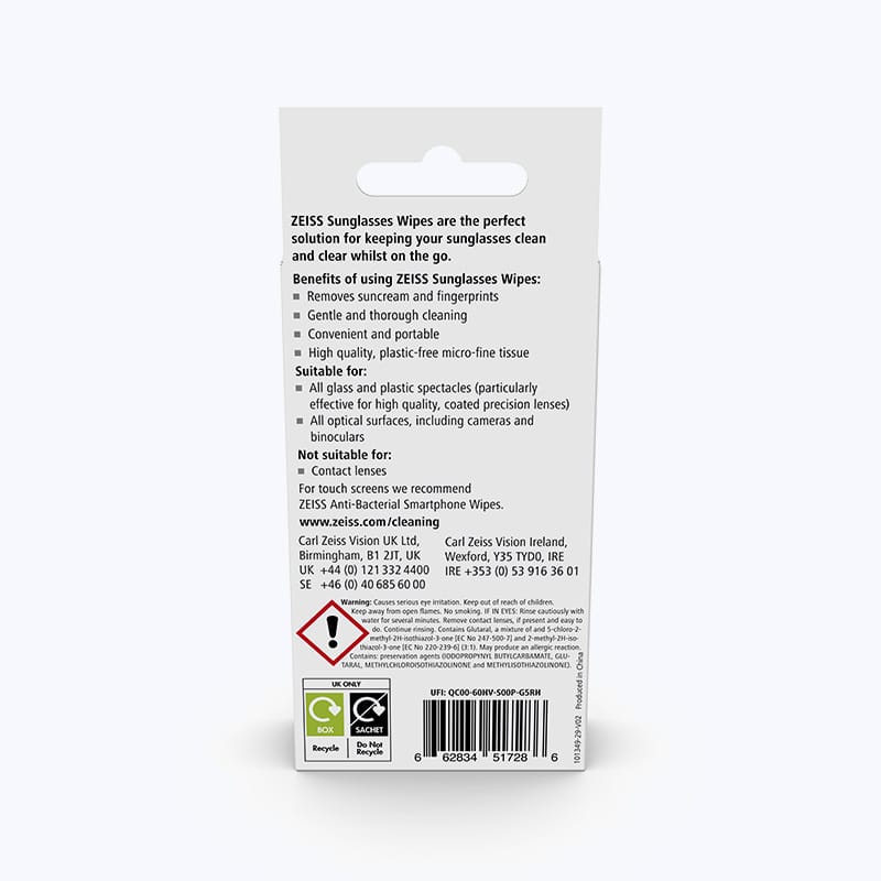 ZEISS Sunglasses Wipes are soft microfine tissues made from natural cellulose and are free from plastic microbeads.